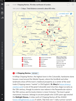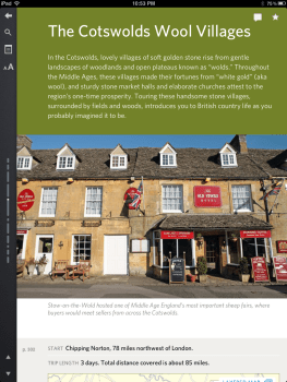 Working with an eBook design firm called Inkling, Frommer’s offers a more ambitious take on the digital travel guide. The eBook is organized in chapters, but each chapter begins with several points of entry: favorite moments in the region, a three-day trip, a five-day journey, favorite sites to visit, popular destinations in detail, and more. Choose the Cotswolds village of Moreton-on-the-Marsh and there’s a well-written description of the village, tips about what’s nearby, quick access to area maps, and an overall design that’s clearly designed for digital devices. This series is called “Day by Day”, so I expected an itinerary planner to coordinate with my iPad’s Calendar app. That’s not yet a feature, but I suspect it was discussed during this superior product’s design phases.