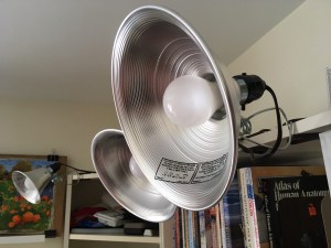 Next issue: lighting. There were two bedroom windows, north-facing, but they didn’t provide much light for work during the day (and, of course, they were useless at night). For a larger pastel work, I needed substantial illumination from above and behind me. It was worth thinking this through. I started by clamping old inexpensive photography lights–the kind used by every student because they’re inexpensive, onto the top shelf of the bookcase. I replaced them with smaller versions of the same thing, and spent about $40, including daylight bulbs (once quite hard to find and expensive, they’re now common and cheap).