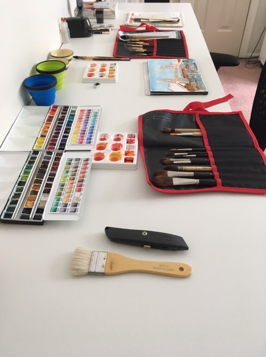 The flood lights were wonderful for work at the easel, but far too bright for every day room lighting, and totally useless for watercolor and drawing at the desk, I researched task lights–somewhat unfamiliar to me–and found a very cool company called Daylight. They make lights for all sorts of very specific tasks–that is, lights that can focus illumination on close-up jobs like sewing and applying make-up–jobs that require odd angles, or a lot of light in a very small space.For watercolor and drawing, I want a concentrated pool of light in the work area, but I don’t want to light up the whole room (which can be distracting).